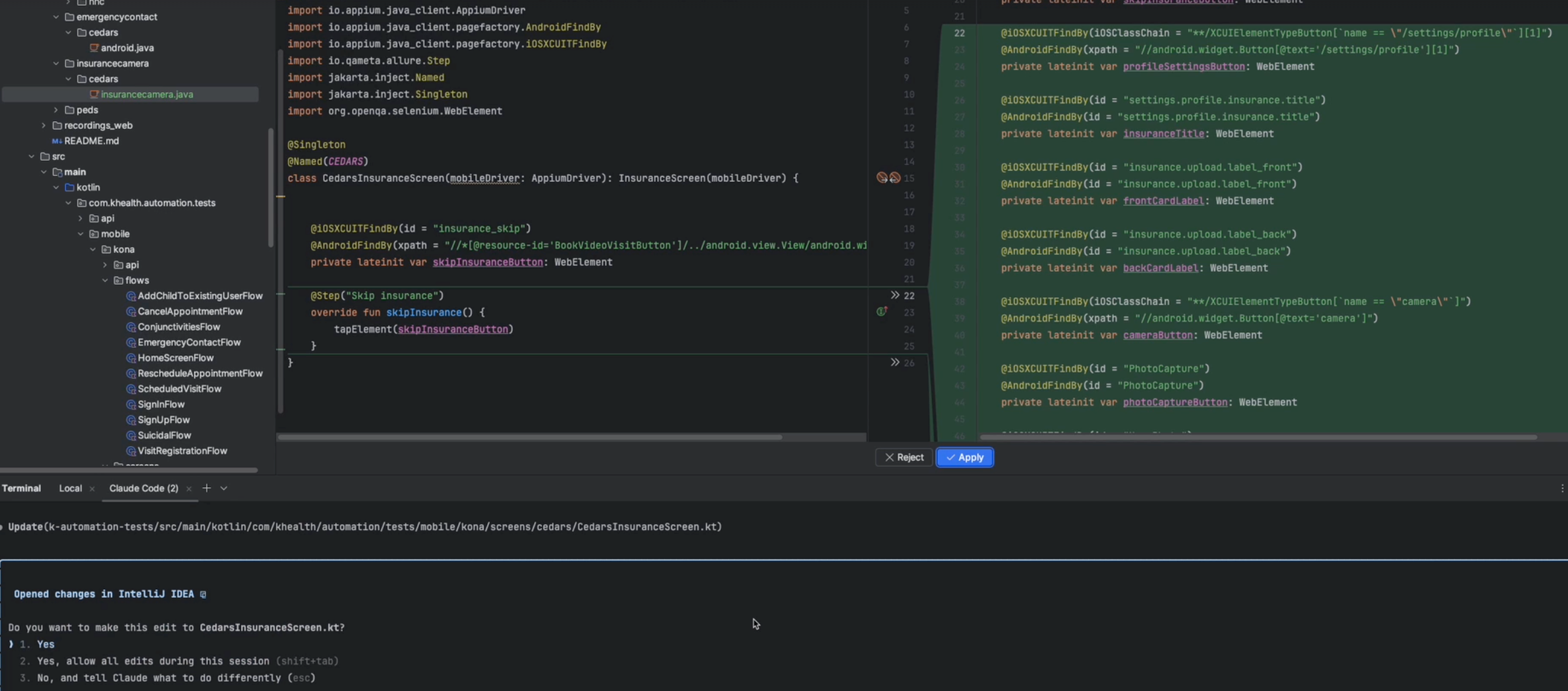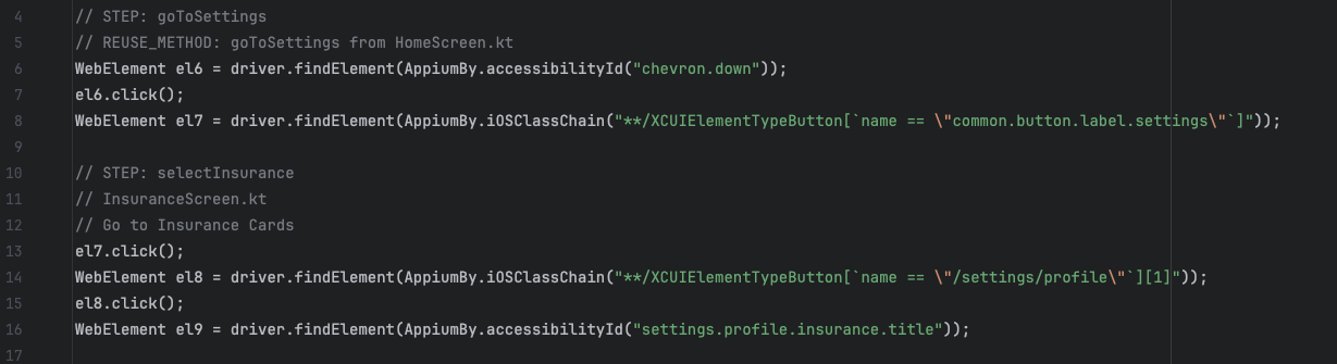 - Using a recorder tool, the QA clicks through the scenario. Each action (tap, input, upload) is captured into a Java file.
